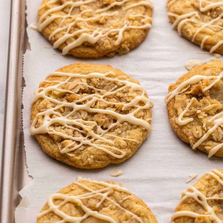 Ces Biscuits Croquants aux Pommes sont remplis de morceaux de pomme fraîche, surmontés d’un streusel à la cannelle et au sucre brun, et finis avec un glaçage à l’érable. Vous obtenez toutes les saveurs d’un crumble aux pommes dans un biscuit moelleux !