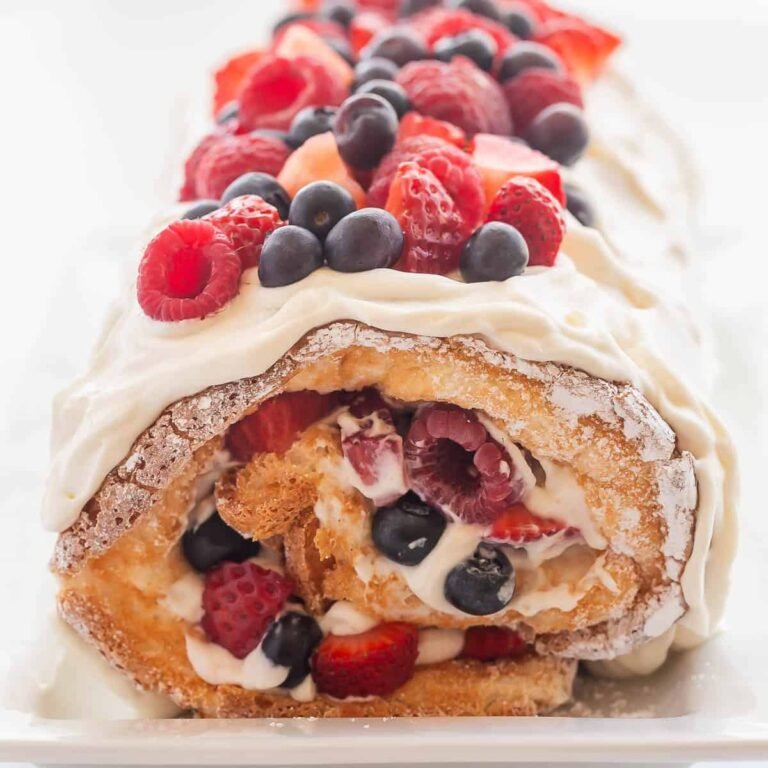 Ce roulé de gâteau angélique aux trois baies est un dessert d’été facile, chargé de baies fraîches ! Réalisez-le en rouge, blanc et bleu ou simplement en rouge et blanc pour célébrer les vacances estivales !