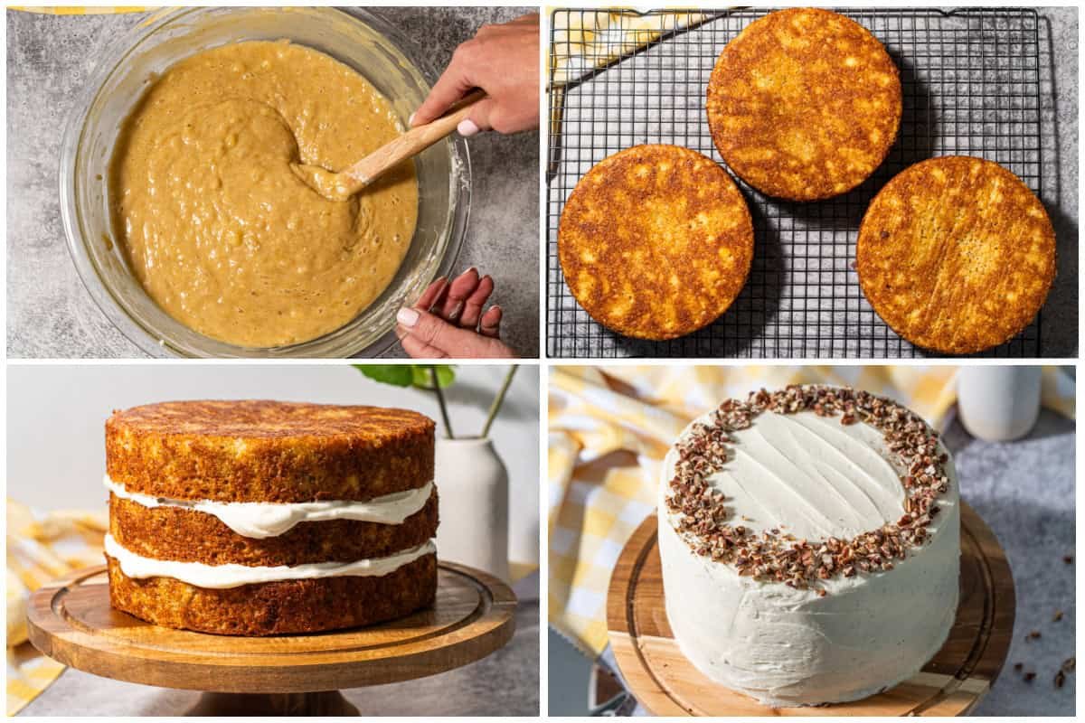 Assemblage : Placer une couche de gâteau sur un plat de service. Étendre environ ½ tasse de glaçage uniformément sur le dessus. Répéter avec les couches restantes. Glaçer les côtés du gâteau et garnir de noix de pécan hachées si désiré. Réfrigérer le gâteau pendant au moins 30 minutes avant de servir.