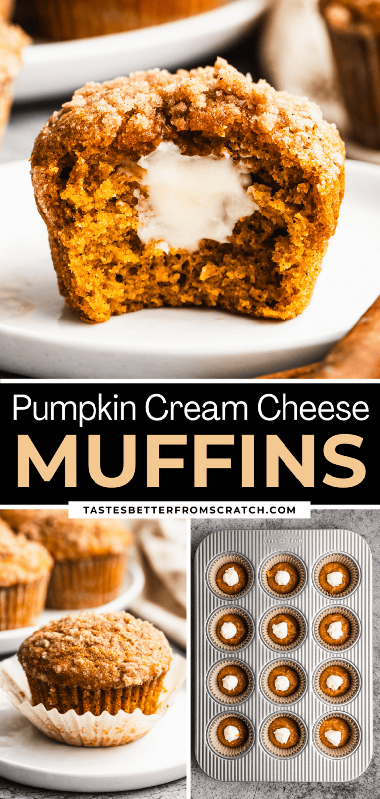 Des muffins à la citrouille et au cream cheese sont des muffins moelleux et humides à la saveur de citrouille, garnis d’un centre crémeux au cheesecake et nappés d’une streusel beurrée. Cette recette facile d’automne est encore meilleure que celles des boulangeries et constitue un parfait petit déjeuner sucré, un en-cas ou un dessert.