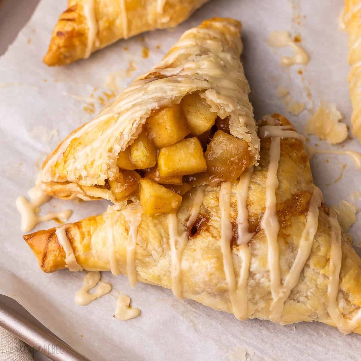 Ces Chaussons aux Pommes faciles sont remplis d’une garniture sucrée de pommes, enveloppée dans des feuilles de pâte feuilletée achetées en magasin, et arrosés d’un glaçage à l’érable délicieux. C’est comme une tarte aux pommes enveloppée dans un petit paquet feuilleté et beurré !