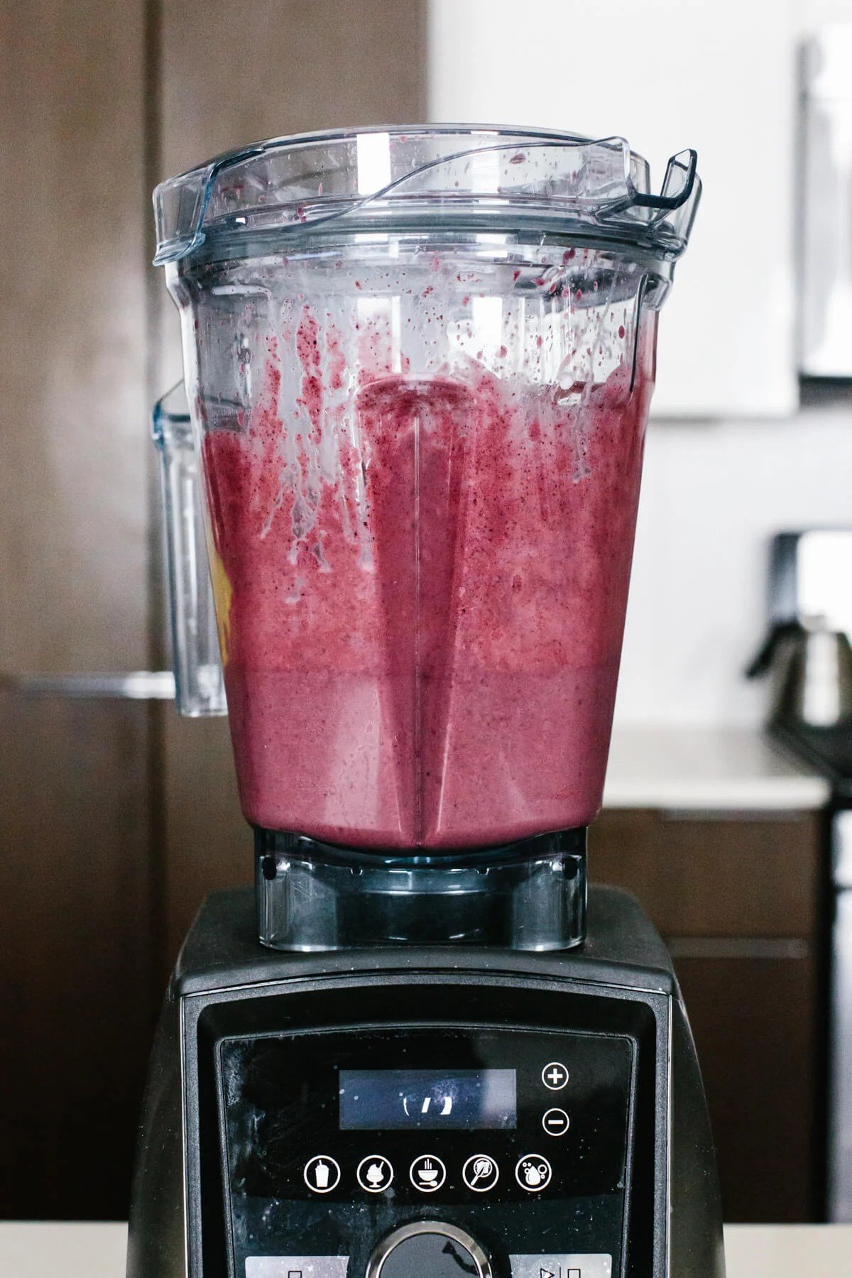 Astuce utile : Rappelez-vous que le pousseur de votre blender est votre ami. Vous voulez que le bol de smoothie soit épais et froid, donc cela signifie que vous devrez utiliser le pousseur pour enfoncer tous les ingrédients dans les lames.